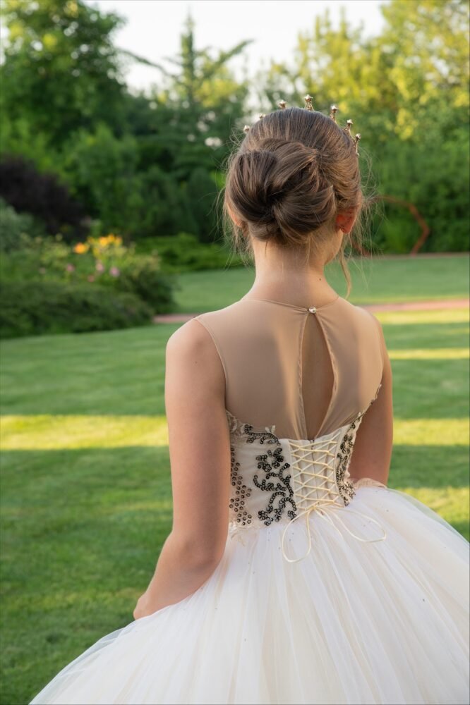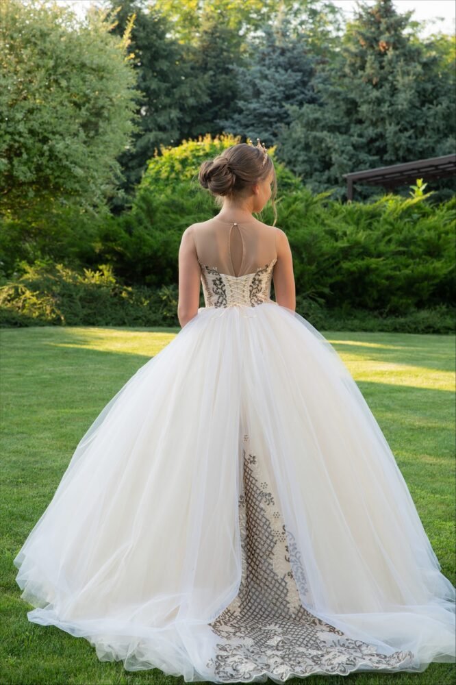 The Elisabeth gown is a striking fusion of elegance and contrast. Designed in crisp white with bold dark embroidery, this floor-length ball gown features a fitted bodice with delicate straps and a voluminous tulle skirt that flows with grace. The vertical embroidery adds regal structure, while the matching tiara completes the look with royal flair.